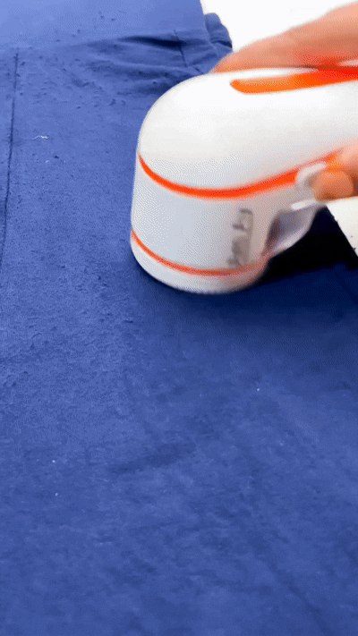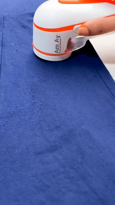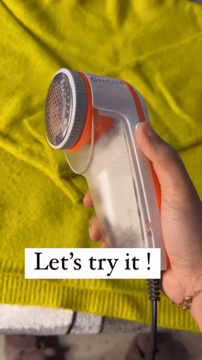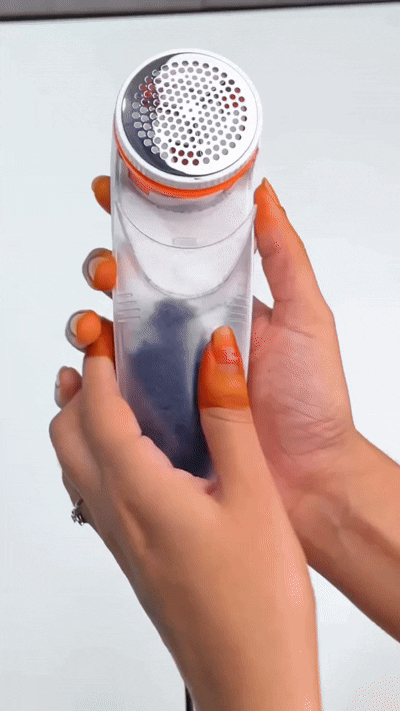 THE LINT REMOVER WORKS BY GENTLY SHAVING OFF LINT AND FUZZ WITH ITS ROTATING BLADES AND COLLECTING THEM IN A REMOVABLE COMPARTMENT, MAKING YOUR CLOTHES LOOKFRESH AND NEW