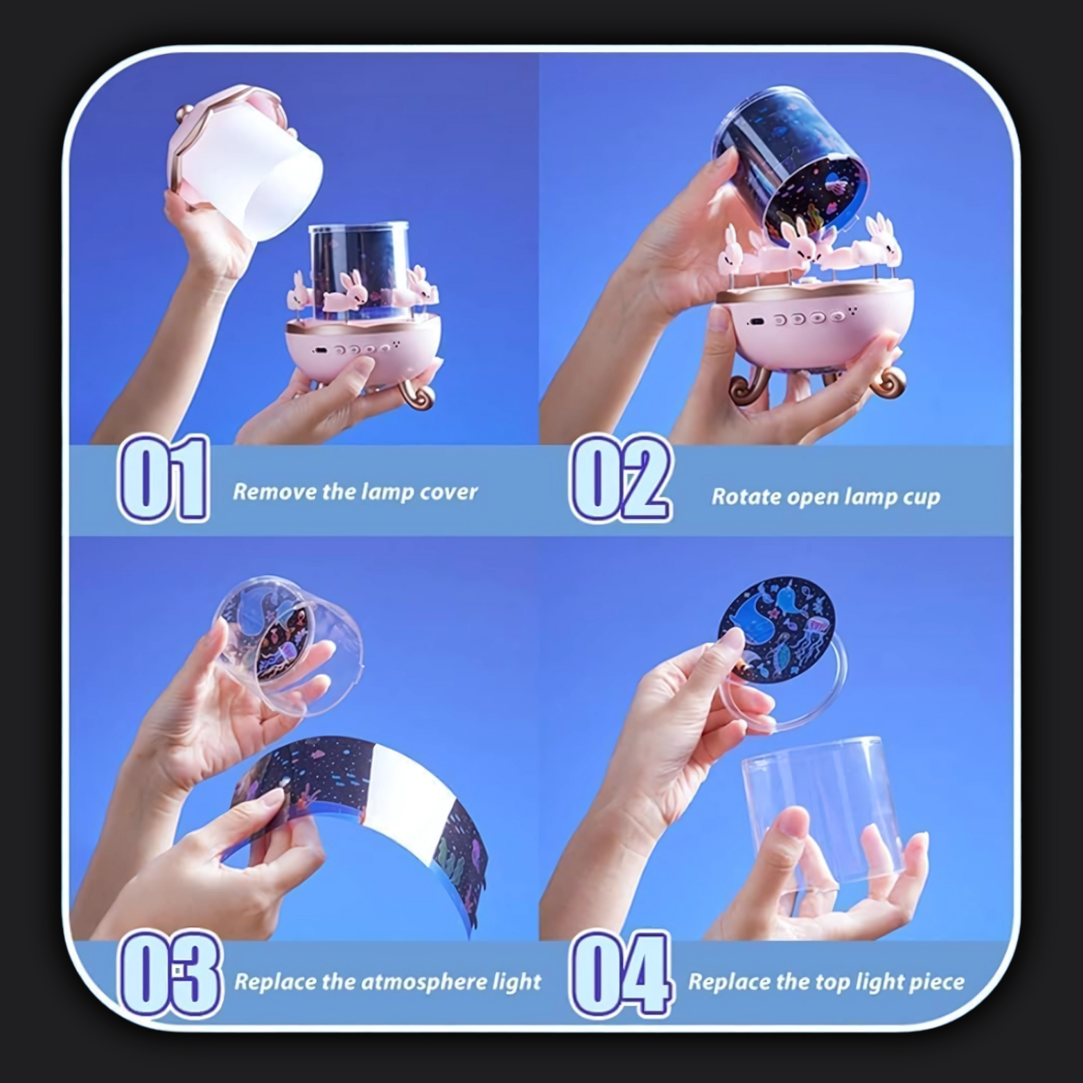 To change its animation, just open the lamp cup, replace the film/slide inside with a new one, and close it again.